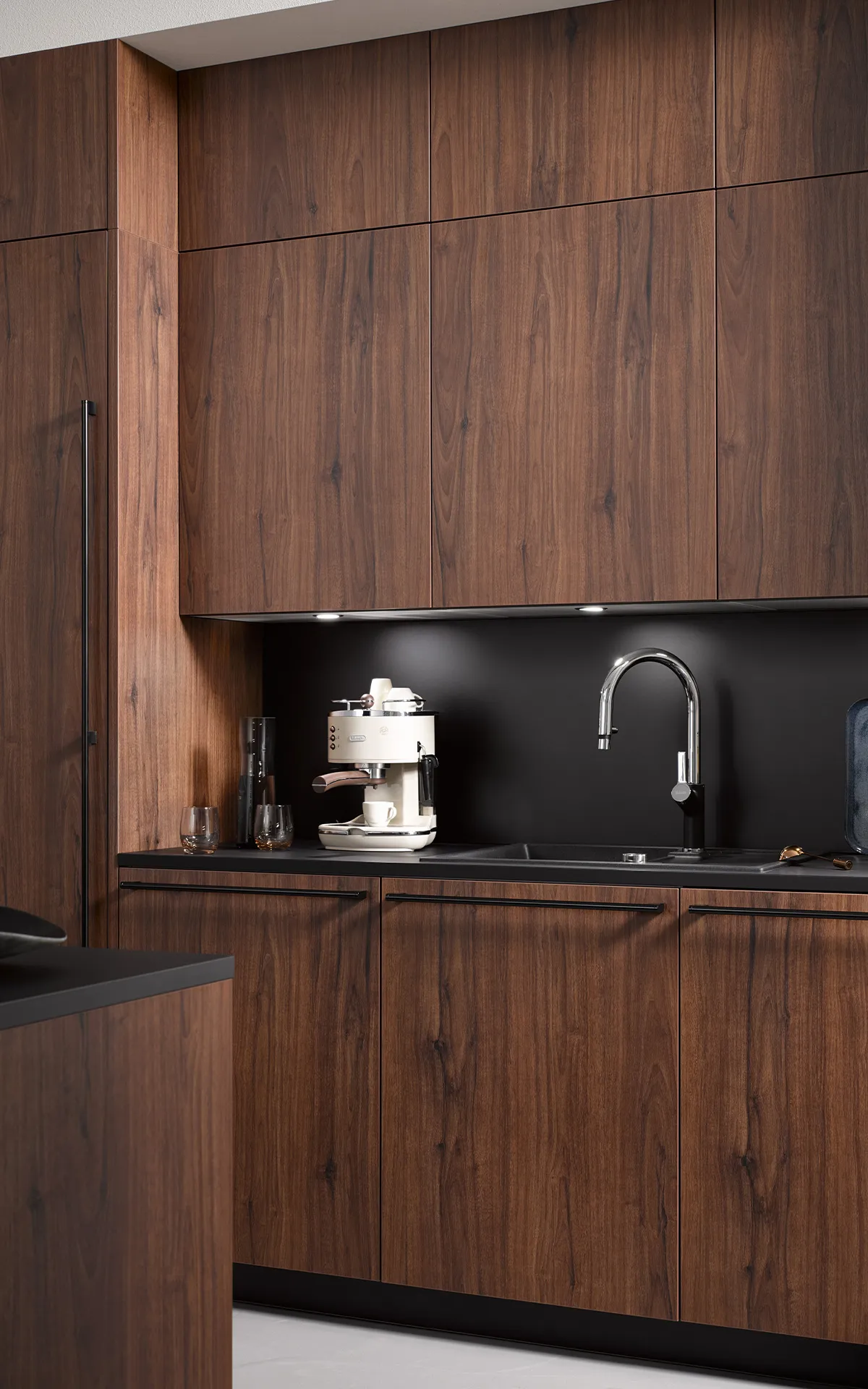 The Roma kitchen design is entirely in the color graphite. It features cassette-style fronts with black handles on doors and pull-outs, and matching wall units with glass panels. The wood-like worktop and wall paneling add warmth to the overall design. Graphite is a modern and popular shade, not only for home interiors, but also in fashion and cars.